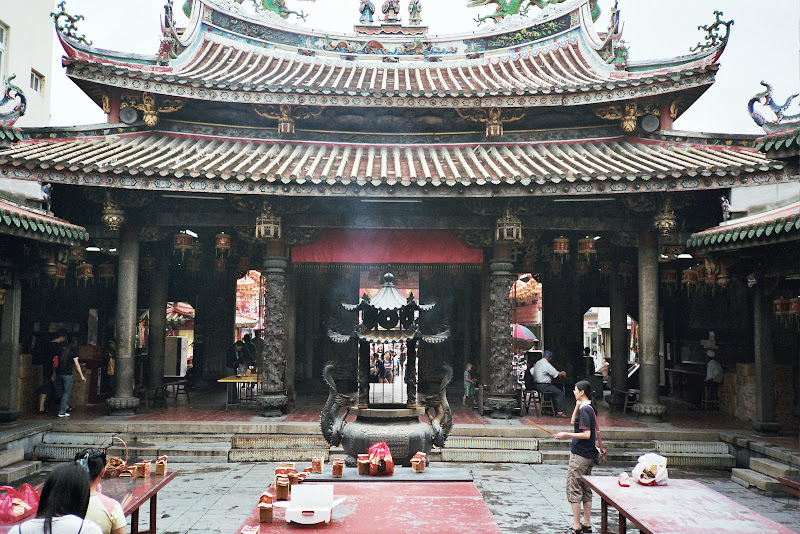 車在鹿港的街道上順暢的滑行著,我們只大概看路標知道天后宮在哪。隨便在一個沒人管理也不知道要不要收錢的停車場停好車。很奇怪的,禮拜六接近中午的天后宮沒什麼人,沒人出聲的就自動解散進入逛廟拍照行程,我拿出剛剛在車上炫耀過的Yashica T5D準備按下第一次快門.....咦?我已經按了嗎?網路上說這台的快門半按非常淺,我之前試按了兩張,感覺沒有這張這麼誇張啊,根本不覺得已經按下去的情況下,捲片的聲音從眼前的相機傳來,液晶螢幕的數字從2變成3了......至於天后宮,嗯,這麼說吧,我比較喜歡祖師廟。
